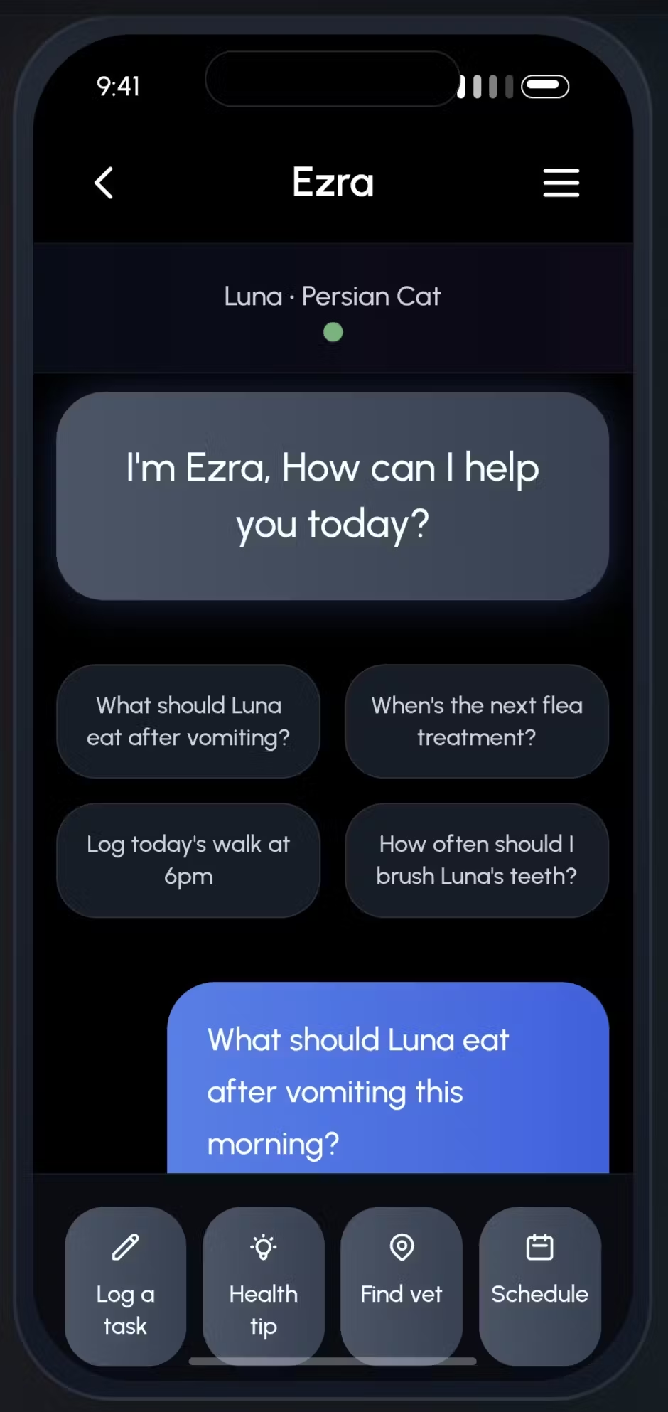At its core is Ezra, your personal AI companion designed to know your pet as well as you do and be there whenever you need support.